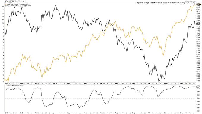 The correlation between stocks and bonds is back to 90% over a 20 trading day period