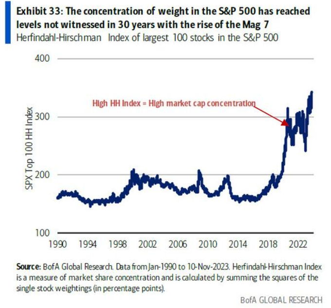 The rise of the Mag 7 has led to a very high market cap concentration in the S&P 500