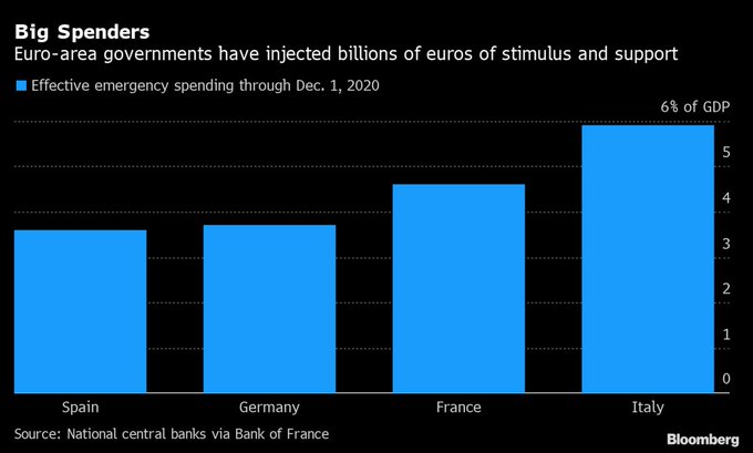 Italy topped the major euro-area nations in fiscal support as a share of the economy in the Covid crisis