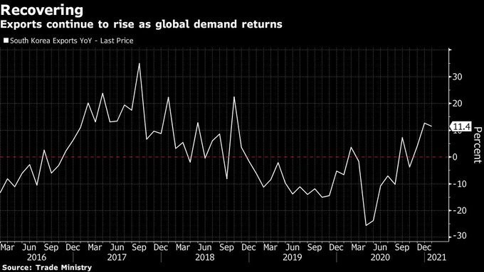 South Korea’s exports posted their best January on record while manufacturing activity reached the strongest level in a decade