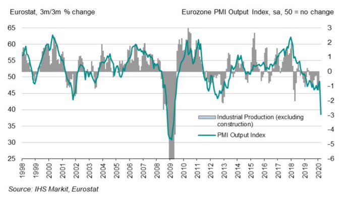 Eurozone production volumes fall sharply and at the strongest rate since April 2009 in March as the global COVID-19 pandemic