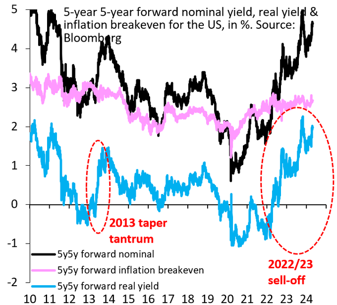 The longer-term US real interest rate (blue) is closing in