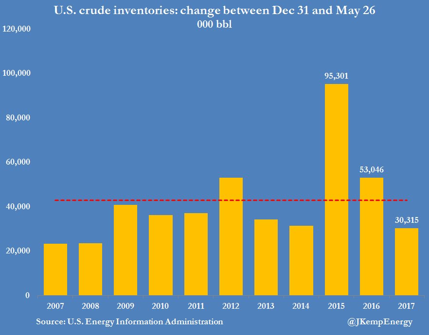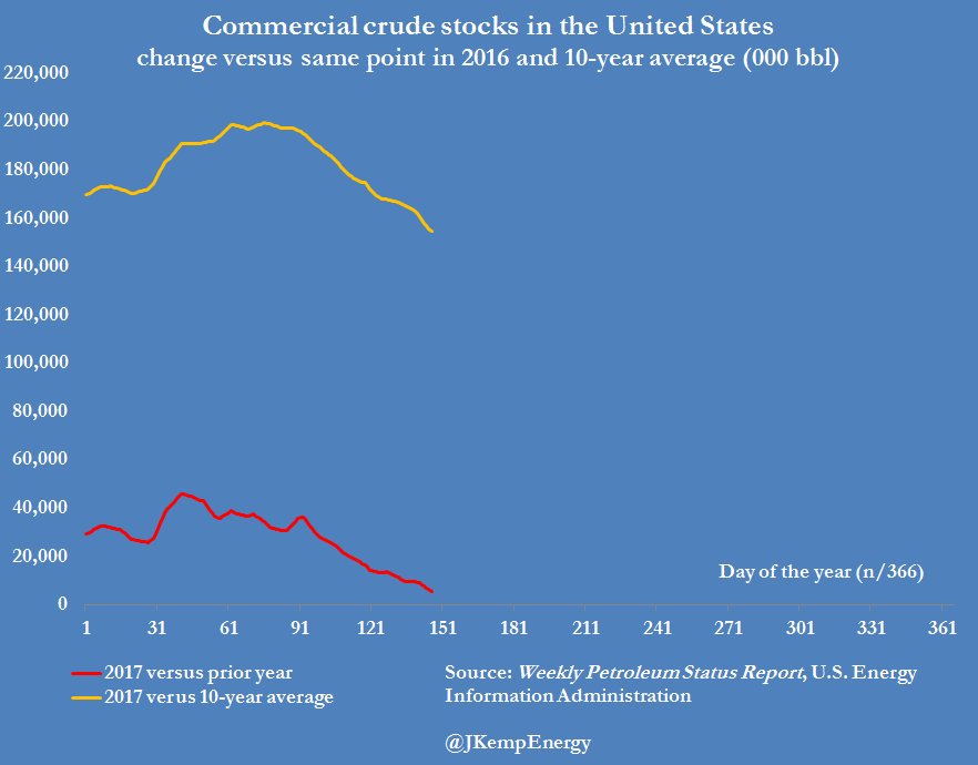 U.S. COMMERCIAL CRUDE STOCKS now up just +30 million bbl from start of year compared with +53 million in 2016 and 10-yr avg of 43 million