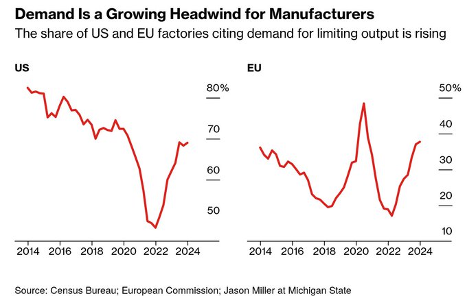 Manufacturers are experiencing a noticeable drop in demand, limiting their output and economic activity both in the US and Europe as growth slows