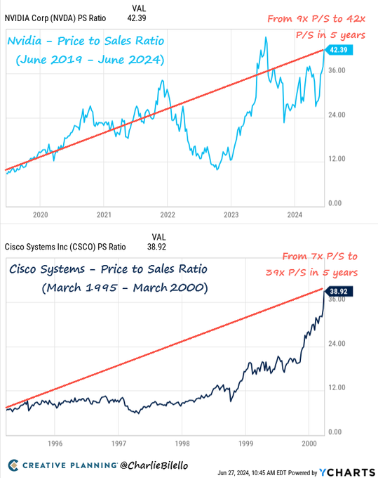 In the 5 years leading up to its peak in March 2000, Cisco's Price to Sales ratio moved from 7x to 39x and it briefly became the world's largest company