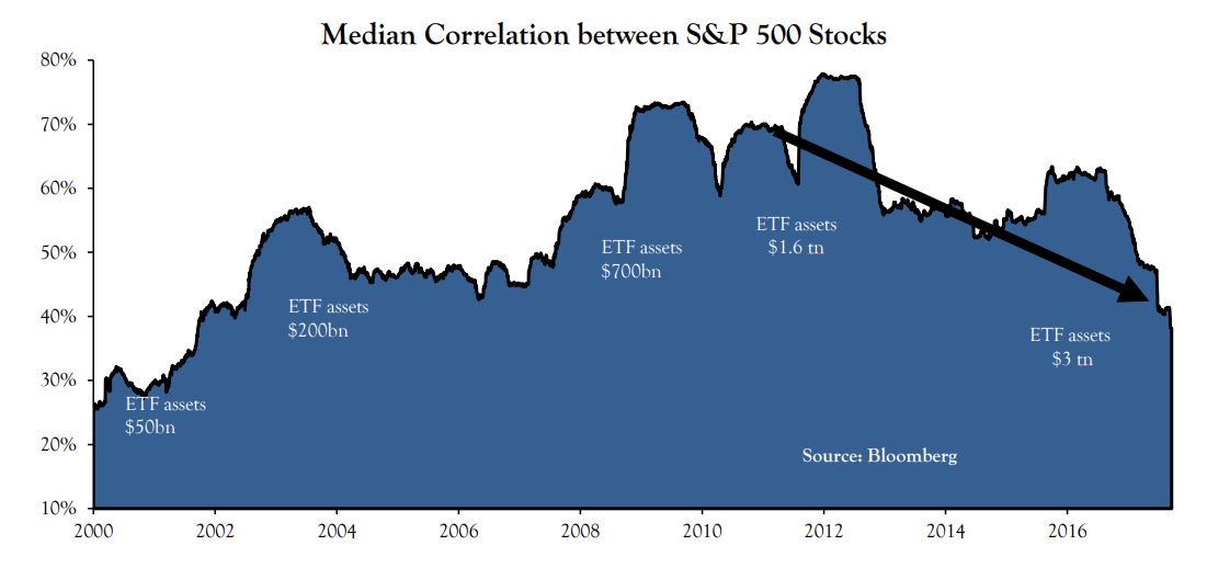 Anyone who says passive investing is killing stocks should read this. Correlations are falling amid ETF adoption