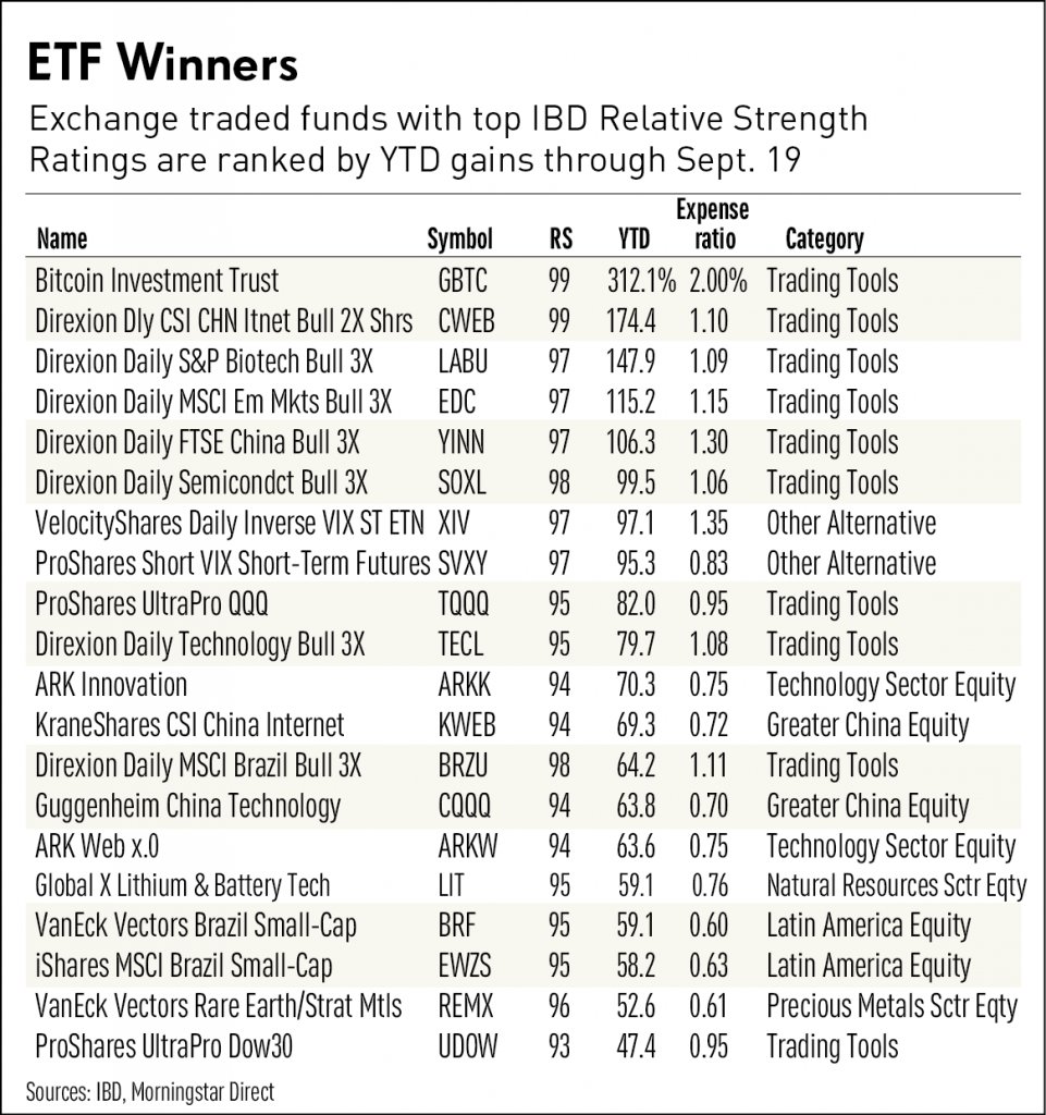 Here's a list of the 20 best ETFs (leveraged included) so far this year. From IBD.