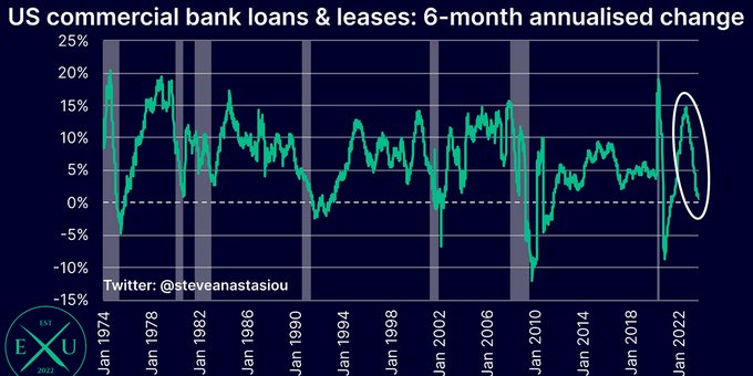 US commercial bank lending has slowed to a crawl, with 6-month annualised growth falling from 14.7% in August 2022, to just 0.6%.