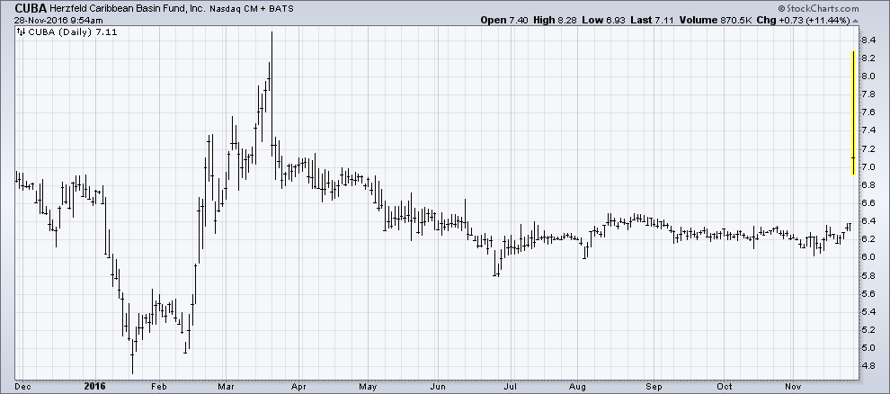 Fidel Castro passed away this weekend and the CUBA ETF is up