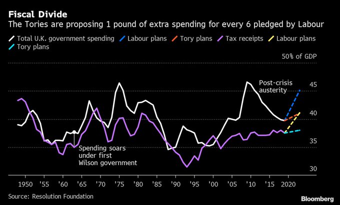 Boris Johnson’s Conservatives are proposing to spend an extra 1 pound for every 6 pledged by Jeremy Corbyn‘s Labour opposition