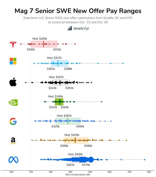 META pays senior software engineers the most and TSLA the least