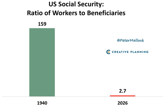 When Social Security first started paying benefits in 1940, there were 159 workers putting money in for every 1 person taking money out.