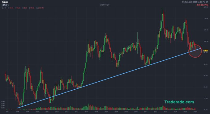 The US dollar is testing its crucial multi-year uptrend now.