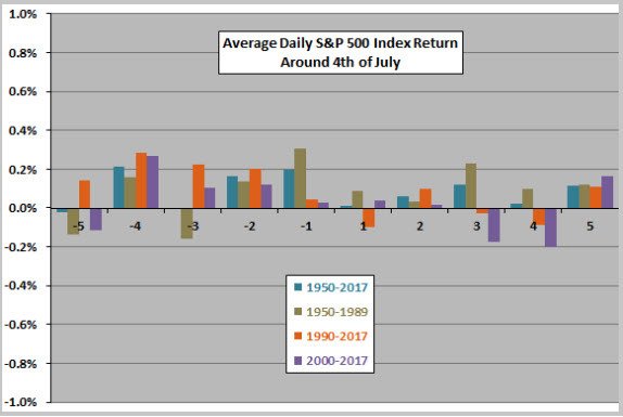 Returns around the 4th of July show a modest positive bias. Here is a historic chart showing 10 day returns around the 4th