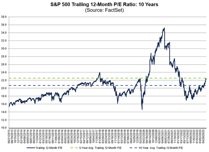 Factset: The trailing 12-month P/E ratio for SPX of 22.4 is below the 5-year average (22.5) but above the 10-year average (20.7).