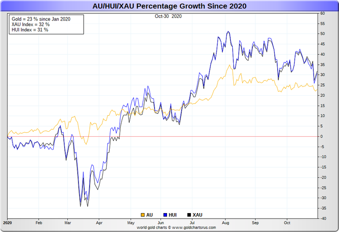 vs Gold Stocks Indexes (XAU, HUI) Percentage Growth in 2020 |