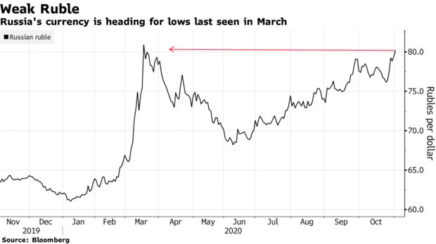 The Russian ruble tumbled past 80 against the dollar, its