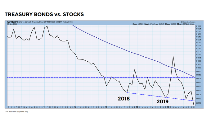 Monthly Treasury Bonds vs. Stocks closed below a trendline