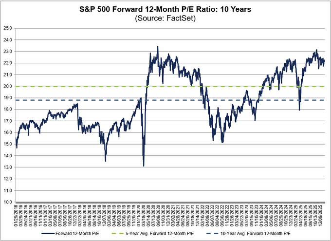 The forward 12-month P/E ratio for SPX is 22.2, which is above the 5-year average (20.0) and above the 10-year average (18.7)