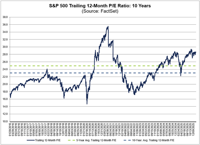 The trailing 12-month P/E ratio for SPX of 28.6 is above the 5-year average (24.9) and above the 10-year average (23.0)