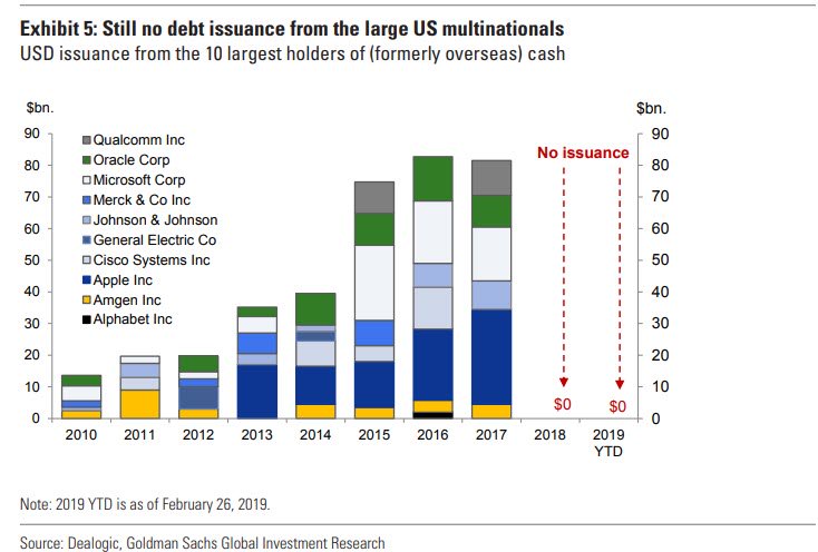 The 10 largest US multinational corporations have not issued any debt in 2018 or 2019