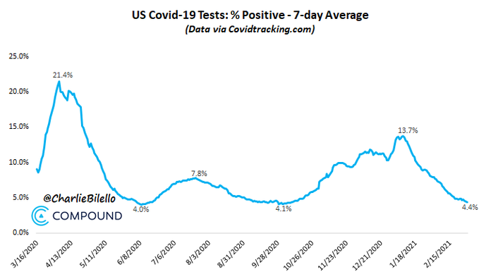 % of positive covid-19 tests in the US moves down to 4.4%,