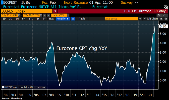 Eurozone inflation hits yet another ATH. Unexpectedly accelerates to 5.8% YoY in Feb, up from 5.1% in Jan and more than the 5.6% median economist estimate in a BBG survey