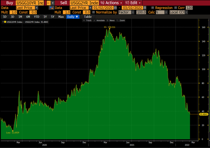 The gap between 2-year and 10-year Treasury yields is now at a new post-March 2020 tight.