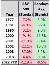 The last 8 times the S&P 500 was down in a calendar year, Bonds finished the year up, cushioning the blow.