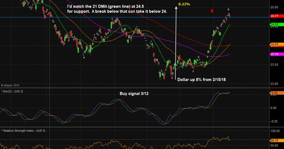 The bullish Dollar ETF UUP is up 8% since its February lows
