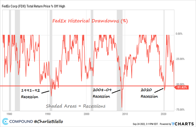 FedEx is now down 52% from its high. The 3 prior 50+% drawdowns in its history all occurred during recessions (1991-92, 2008-09, 2020)