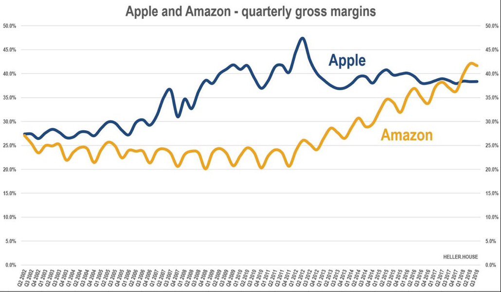 The blue line shows gross margins for Apple AAPL - The yellow line shoes gross margins for Amazon AMZN