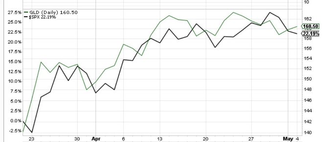 Correlation between gold and S&P off March lows says that when gold goes parabolic so do stocks.