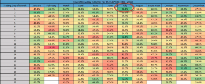 Here is a giant graphic of the S&P 500 that shows how often the markets end higher in each trading day of the month since 1950