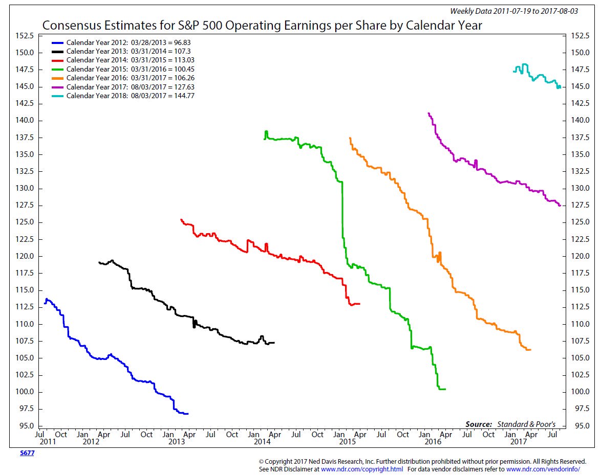 Each year S&P 500 earnings start in one place and end in another. Teal line is 2018 and purple is 2017
