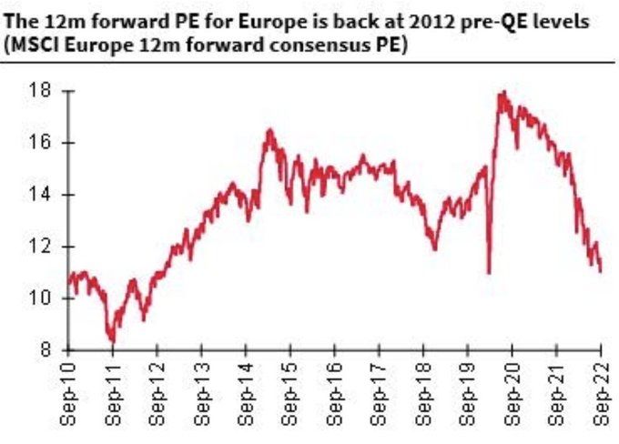 The forward P/E of European stocks has fallen to 2012 levels—SocGen