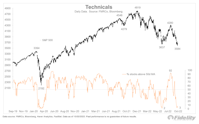 Technically, the markets are very oversold, which the current bounce is now correcting. Here we see that as of last Friday the percentage of stocks above their 50-day moving average was a paltry 3%