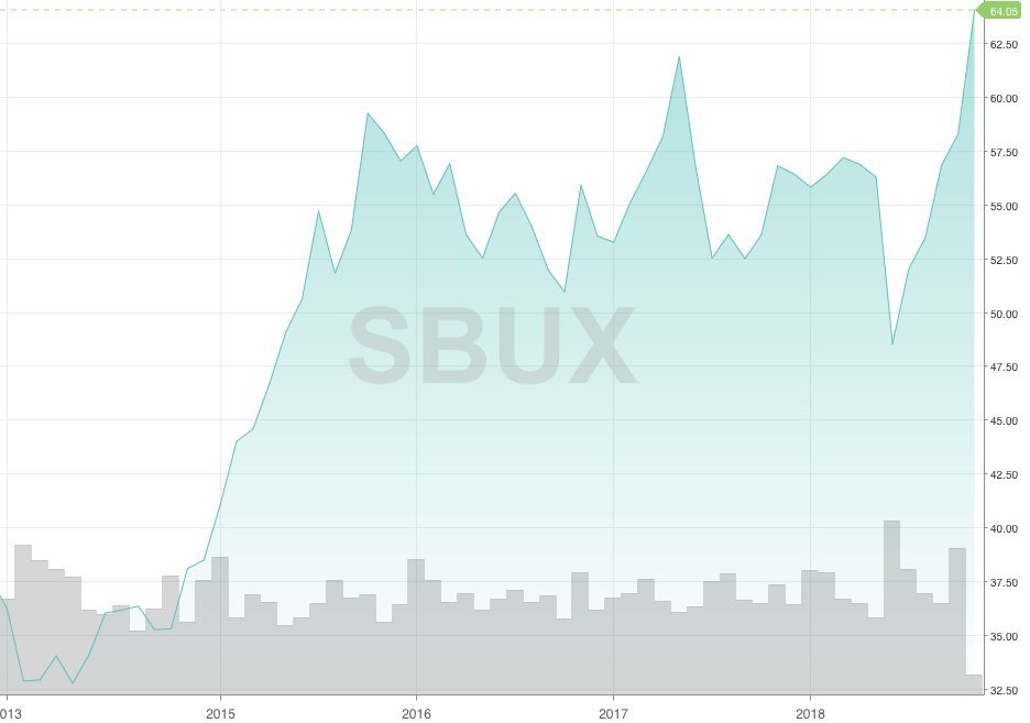 Starbucks is trading at all-time highs today. That means it's now up 41,760% since its 1991 IPO
