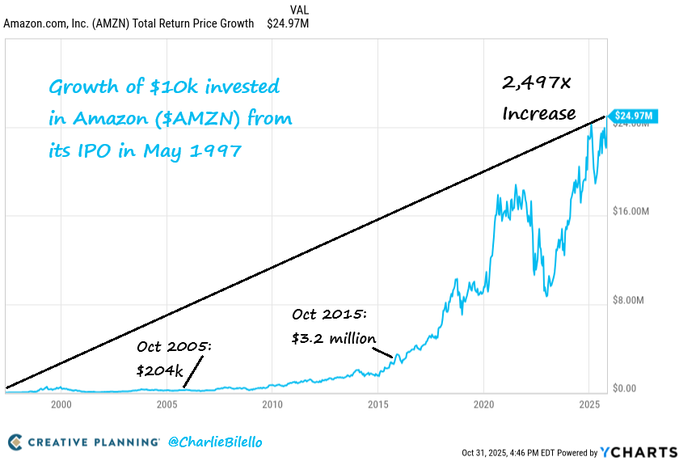 $10,000 invested in Amazon at its IPO in May 1997 is worth nearly $25 million today