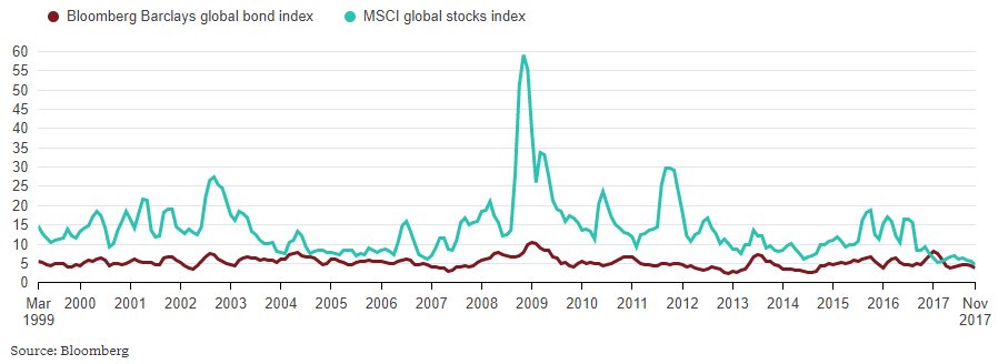 60-day volatility for stocks dropped below that of bonds for the first time this year