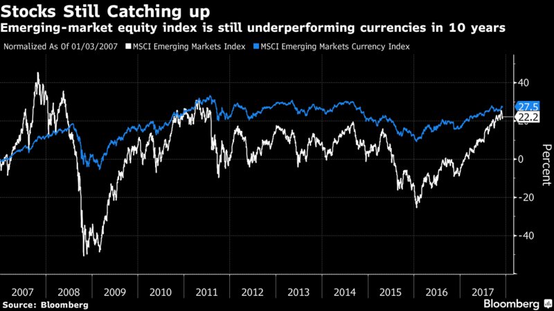 A monster surge in emerging-market stocks is narrowing the gap with developing-nation currencies