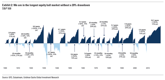 We're in the midst of the longest bull run for stocks without a major drop on record. Via Goldman