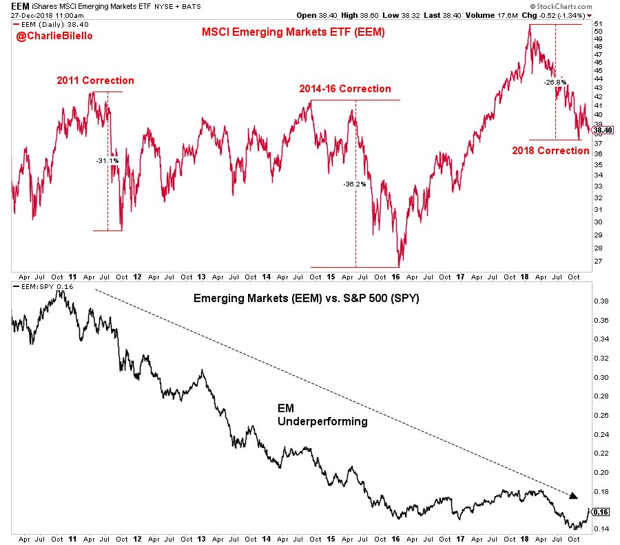 Emerging Markets are down 27% from their Jan high. During the 2014-16 correction they lost 36%. During the 2011 correction they lost 31%