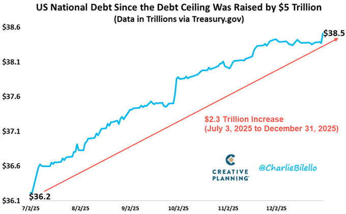 The US National Debt increased by another $2.3 trillion in 2025, ending the year at $38.5 trillion.
