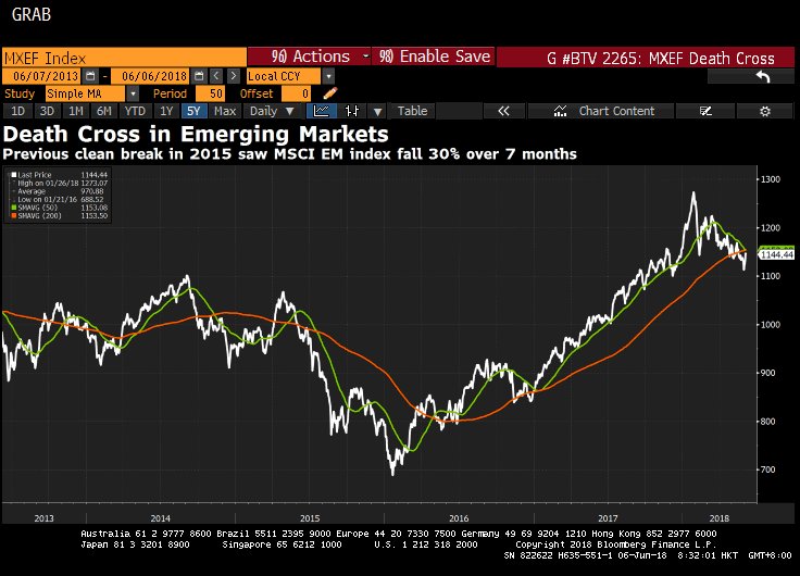 The emerging market stocks index just formed a death cross. When that happened back in 2015, stocks went on to fall 30% over the next 7 months