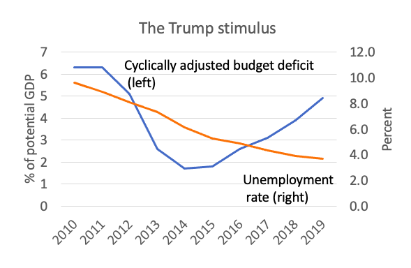 adjusted budget deficit, a rough measure of fiscal stimulus