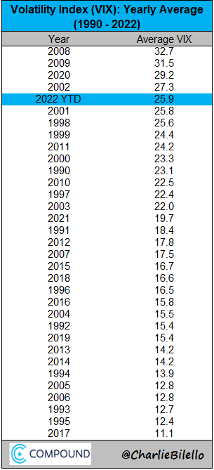 The Volatility Index has averaged 25.9 thus far in 2022. With data starting in 1990, the only years with a higher average VIX: 2008, 2009, 2020, and 2002