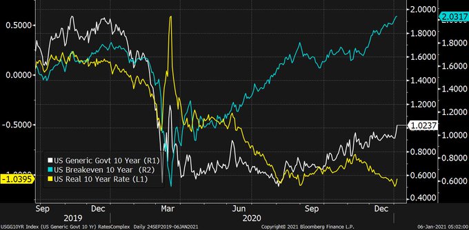 yields are surging, bringing up real yields, implying that