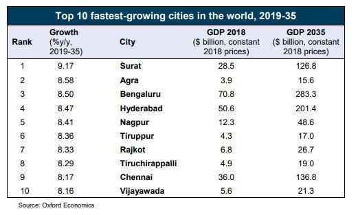 All of the world’s top 10 cities with the fastest-growing economies will be in India