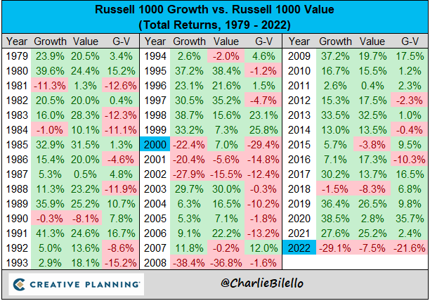 Growth stocks underperformed Value stocks in 2022 by 21.6%,